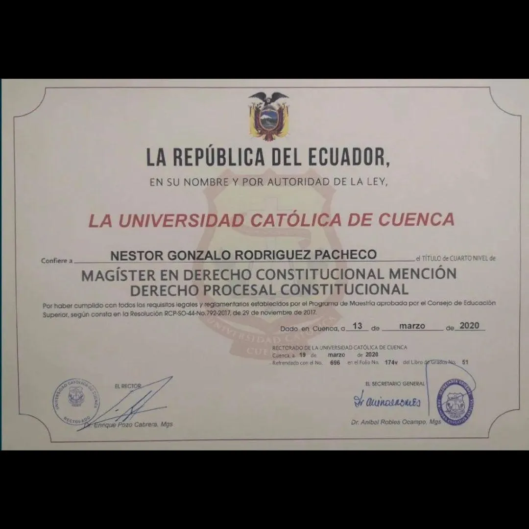 Magíster en Derecho Constitucional, mención Procesal Constitucional, por la Universidad Católica de Cuenca, marzo del 2020.