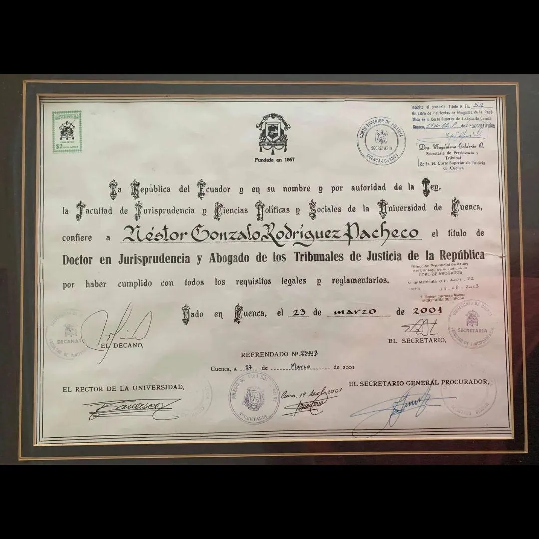 Abogado litigante en el libre ejercicio de la profesión en los Juzgados y Cortes de Ecuador, por más de 20 años.