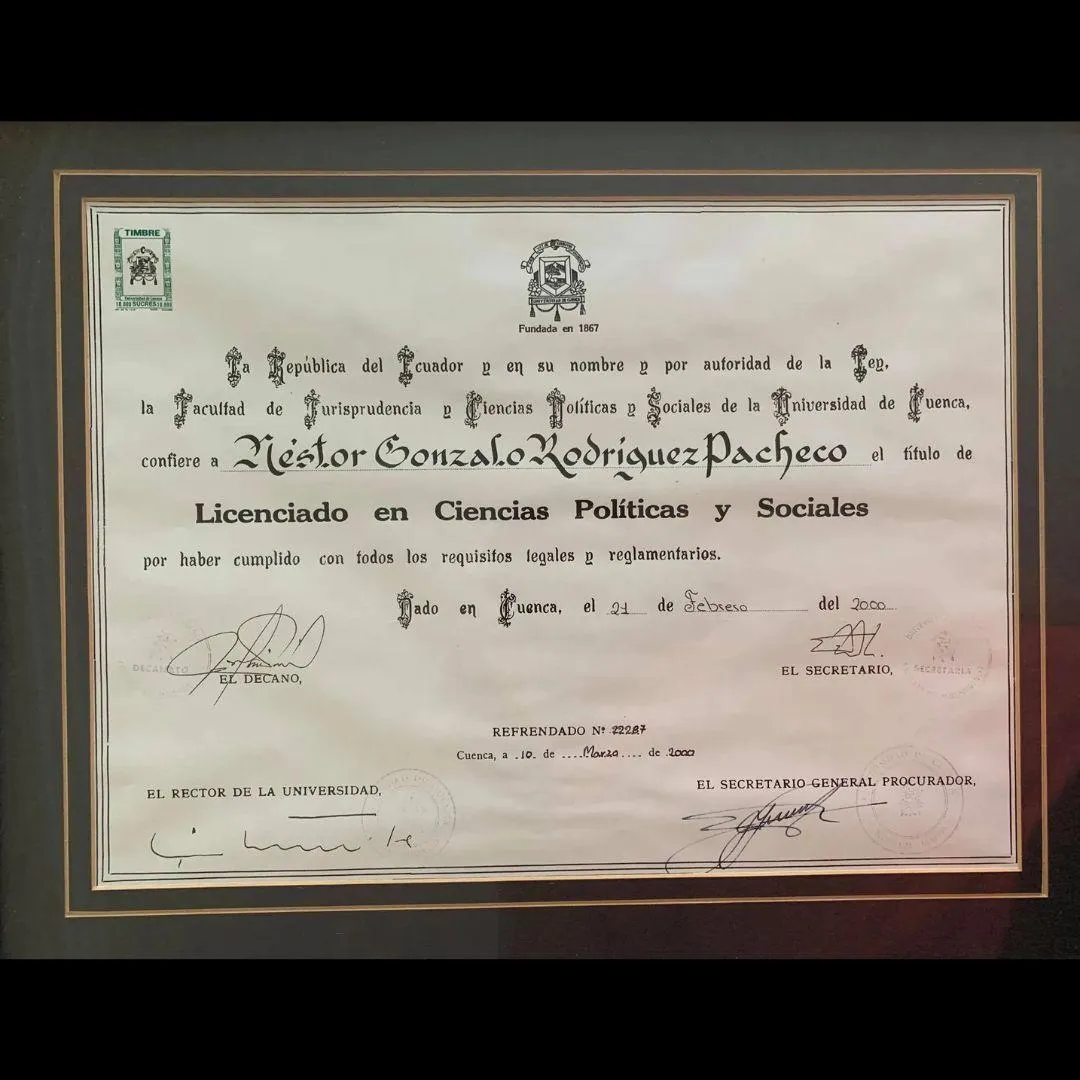 Licenciado en Ciencias Políticas y Sociales por la Universidad de Cuenca, febrero del 2000.